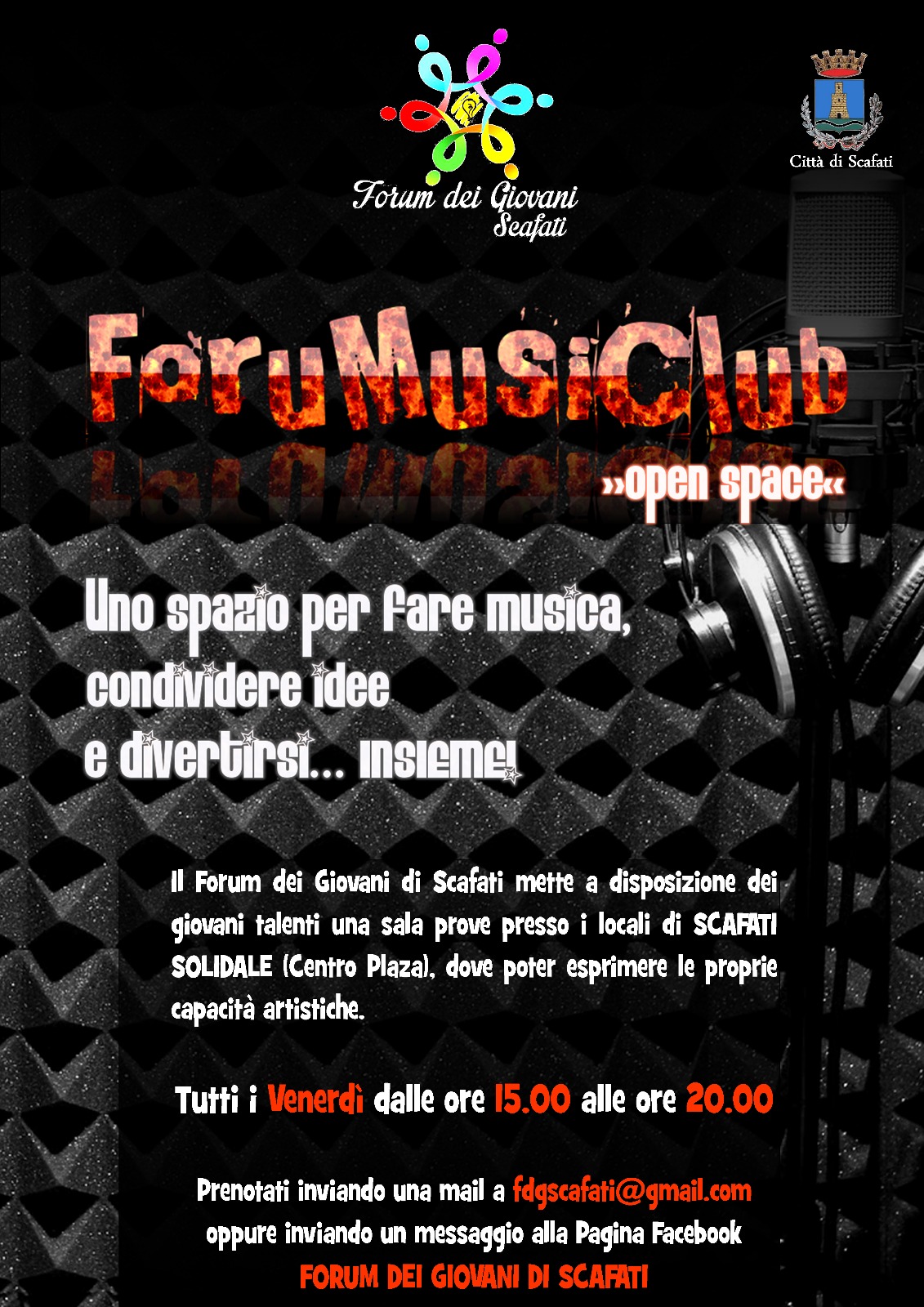 “Forum Music Club” si svolgerà ogni venerdì, dalle ore 15.00 alle ore 20.00, presso i locali di Scafati Solidale, in via E. Berlinguer, 6. Per la raccolta di adesioni e ulteriori informazioni, è sufficiente inviare una mail all’indirizzo di posta elettronicafdgscafati@gmail.com o scrivere un messaggio alla Pagina Facebook del Forum dei Giovani.