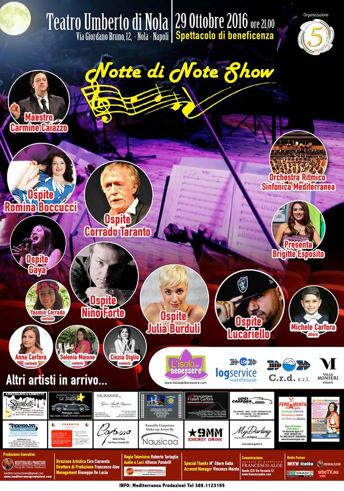 Il 29 ottobre 2016, alle ore 21.00, presso il Teatro Umberto di Nola si terrà il grande concerto “Notte di Note Show” organizzato dall’Associazione 5 Stars Onlus presieduta da Cira Ciaravola, con lo scopo di raccogliere fondi da destinare alla ricerca contro le leucemie e i tumori del sangue. Sulle note dell’Orchestra Ritmico Sinfonica diretta dal grande M° Carmine Caiazzo, produttore discografico della Mediterranea Produzione Cinema, tanti grandi artisti metteranno la loro voce e la loro arte al servizio degli altri, investendo in prima persona e facendosi portavoce con la loro presenza di messaggi positivi e incoraggianti. A presentare la kermesse la giornalista e conduttrice televisiva Brigitte Esposito. Tra gli artisti Lucariello, Julia Burduli, Corrado Taranto, Rosa Chiodo, Ario De Pompeis, Romina Boccucci, Gaia La Ferla, Nino Forte, Michele Carfora, Yasmin Corrado, Cinzia Diglio, Anna Carfora, Selenia Maione e tanti altri. La musica parla alle emozioni e le emozioni sono vita. Insieme in una notte di note per donare una speranza a chi lotta contro gravi malattie.