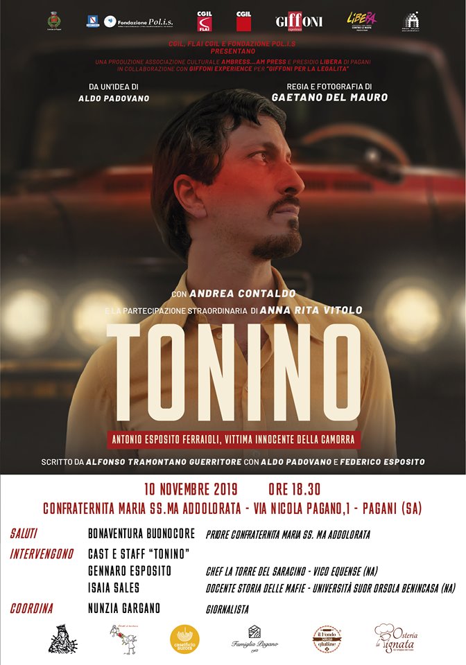 “Tonino” è un cortometraggio dedicato alla memoria di Antonio Esposito Ferraioli, cuoco e sindacalista Cgil ucciso dalla camorra il 30 agosto 1978 a Pagani , in provincia di Salerno. Due colpi di lupara lo ferirono a morte sotto casa della sua futura moglie. Aveva solo 27 anni. La sua colpa, da sindacalista, fu il rifiuto di cucinare carne marcia per la mensa della Fatme, grande stabilimento industriale di Pagani. In fabbrica si era battuto anche per migliorare le condizioni lavorative dei suoi colleghi operai. La camorra non glielo perdonò. Ad oggi non ci sono condanne né per mandanti né per gli esecutori dell’omicidio Esposito Ferraioli.