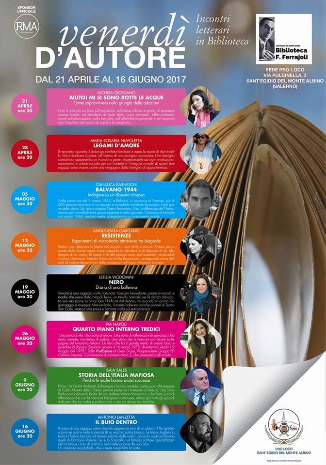 Come sottolinea il presidente della Pro Loco Salvatore Ferraioli: “ I Venerdì d’Autore nascono per due motivi essenziali. Il primo è quello di dare un senso alla neonata biblioteca civica, dedicata all’Archeologo Ferdinando Ferrajoli, nostro concittadino e allievo di Amedeo Maiuri, e ideata con lo specifico scopo di farne un polo culturale aggregatore per la nostra città. Il secondo, perché crediamo che possa essere un buon modo per contribuire alla crescita culturale e civile del nostro paese. Voglio ringraziare Alfonso Tortora, nostro socio, che si è fatto promotore dell’iniziativa e la vice presidente Angela De Rosa che ha coordinato l’organizzazione degli incontri assieme ad alcuni altri soci”.