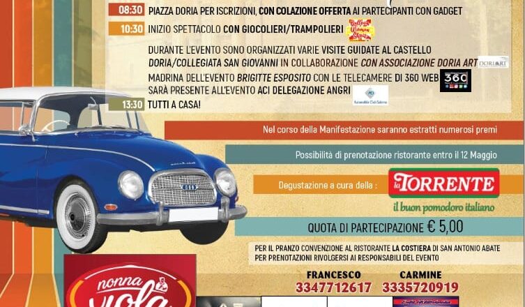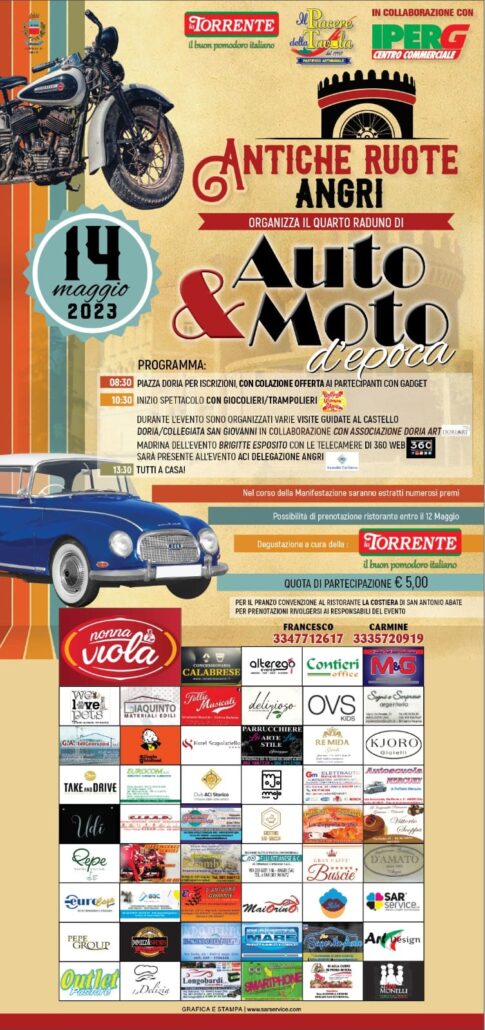 Ad Angri si scaldano i motori: al via la IV^ edizione del Raduno d’Auto & Moto d’Epoca organizzata dall’Associazione Antiche Ruote Angri, presieduta da Carmine Nocera e in programma domenica 14 maggio 2023.