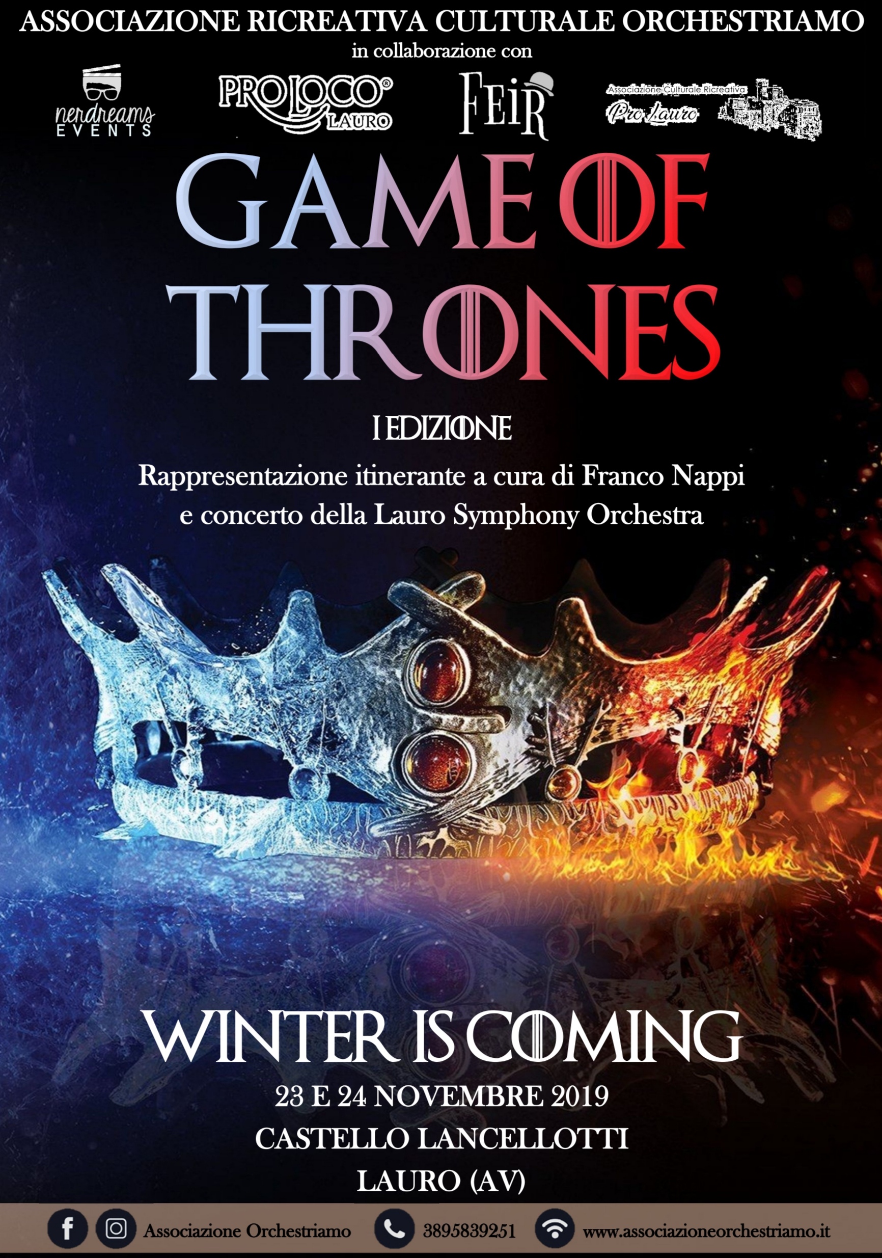 Un evento epico organizzato dall’Associazione Ricreativa Culturale Orchestriamo in collaborazione con le associazione Pro Lauro e Pro Loco Nuova Lauro, Feir-teatro ed eventi e Lauro Symphony Orchestra. La manifestazione sarà articolata in più parti: rappresentazione itinerante negli ambienti nobiliari del Castello a cura dell’attore e regista Franco Nappi, spettacoli ed attività d’intrattenimento che gli spettatori troveranno, al termine della rappresentazione, nel primo cortile del maestoso maniero e, per concludere, un concerto della Lauro Symphony Orchestra, la quale proporrà le più belle e famose colonne sonore che hanno accompagnato in questi anni il pubblico nel fantastico mondo di Westeros.