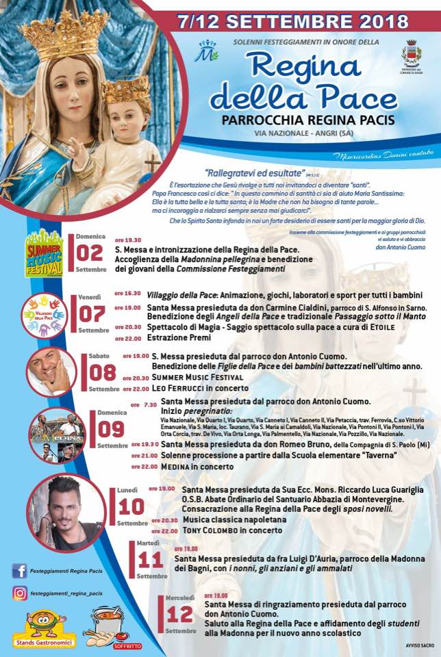 Nella città di Angri fervono i preparativi per la grande festa in onore di Maria Regina della Pace che si terrà in Via Nazionale e in Corso Vittorio Emanuele dal 7 al 12 settembre 2018. La Comunità Parrocchiale Regina Pacis guidata da don Antonio Cuomo e il Comitato Festeggiamenti hanno previsto un ricco e coinvolgente programma civile. Di seguito l’official spot SPOT con tutti gli appuntamenti: