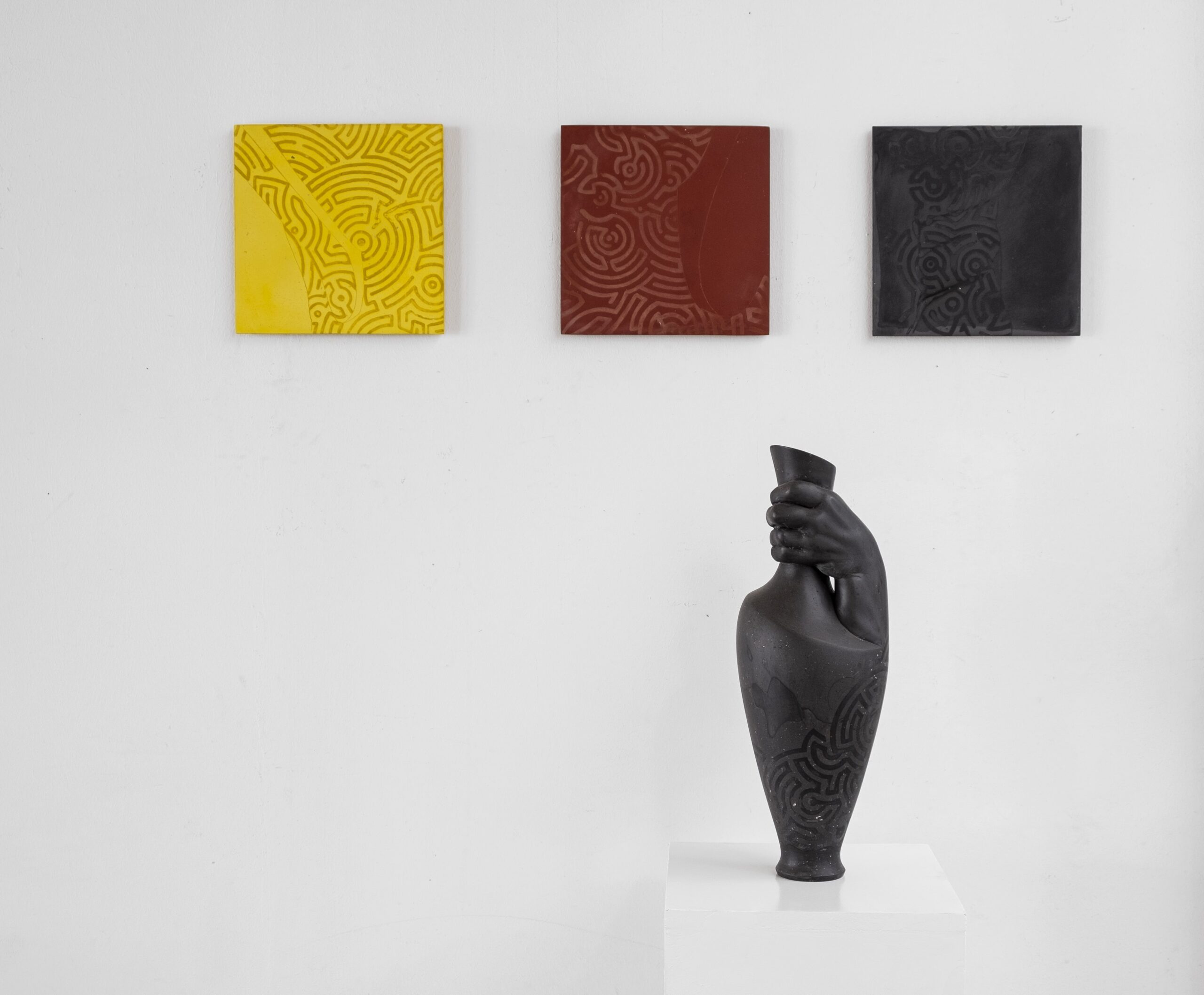 Nel nuovo progetto realizzato in esclusiva per la galleria di via Pasquale Scura, tre figure antropomorfe dalle dimensioni imponenti affiancano elementi anch’essi ibridi, combinazione di oggetto e umano, che parlano di storie e di identità. Le sculture in resina pigmentata, Caraffante 22Bottiglia 22, e Boccale 22, sono la rielaborazione di un progetto del 2004, in cui Domenico Borrelli espleta la sua attuale ricerca sul corpo, su una umanità mostrata parzialmente e contenuta da recipienti, gli esseri portatori e contenitori del carburante vitale dell’uomo, energia che viene a mancare o da proteggere, da conservare. La fusione dell’immagine classica e dell’oggetto creato dallo stesso uomo pone una domanda esistenziale – è l’uomo che diventa bottiglia oppure è la bottiglia a diventare uomo? Le incisioni che appaiono sulla superficie degli esseri mutanti contribuiscono ad una nuova lettura delle opere, come tatuaggi su pelle, sono timbri, segni labirintici che scavano e citano  la città di Napoli con il suo passato, il mito e l’archeologia. Le tre sculture tendono a rappresentare la trasformazione imminente dell’essere, emblemi di una società che si trova di fronte a un cambiamento epocale, che ci conduce a riconsiderare la forma, la bellezza, lo spazio.