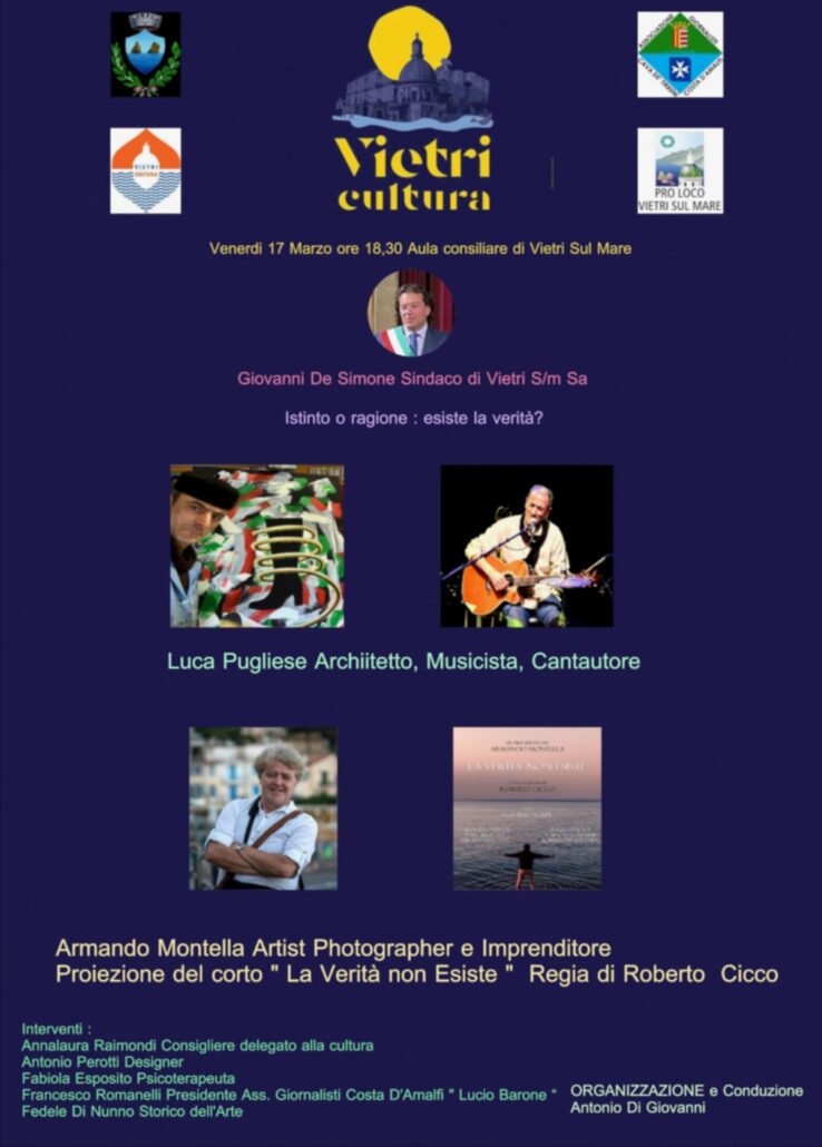 Nuovo appuntamento venerdi 17 marzo a Vietri sul mare alle 18,30 , presso l’aula consiliare del comune di Vietri sul mare, con la serie di incontri dal titolo: “Dialoghi tra Arte e Letteratura: fatti non foste a viver come bruti…” organizzati dal giornalista Antonio Di Giovanni, con la collaborazione del designer Antonio Perotti, nell’ambito della rassegna culturale invernale,organizzata dal comune di Vietri sul mare “Vietri Cultura”,sotto la direzione artistica di Luigi Avallone ,con il patrocinio dell’Associazione Giornalisti Cava –Costa d’Amalfi”Lucio Barone,” e della Proloco di Vietri sul mare. Il fil-rouge della serata, sarà “Istinto o ragione:esiste la verità? “. Dopo i saluti del sindaco di Vietri sul mare Giovanni de Simone , di Francesco Romanelli presidente dell’Associazione giornalisti Cava dè Tirreni –Costa d’Amalfi “Lucio Barone” e del consigliere delegato alla cultura Annalaura Raimondi, a dialogare questa volta tra le loro “arti” saranno Luca Pugliese ,che presenterà, insieme ad Antonio Perotti , alcune opere pittoriche che rappresentano parte del suo percorso culturale ed artistico e Armando Montella, imprenditore e autore del corto “La verità non esiste” girato per la maggior parte a Vietri sul mare. Il film, ideato e sceneggiato dall’imprenditore cavese, per la regia di Roberto Cicco, narra la storia la storia di Roberto, un uomo che perde la memoria a causa di una malattia. Il protagonista riuscirà a ricordare la sua storia grazie all’aiuto della moglie e dell’amico di una vita. Nella sua bella villa affacciata sul mare ritrova anche la grande passione trasmessagli da suo zio fin da quando era piccolo, quella per la fotografia. Questa riscoperta fa anche riaffiorare il dilemma che lo assilla da sempre: seguire la ragione, che lo ha portato ad essere l’uomo che è oggi, con una vita agiata ma conformistica e abitudinaria, tutta dedita alla famiglia e al lavoro. Ragione o istinto: qual è la verità? Se esiste la verità… Cantautore, architetto ,pittore Luca Pugliese ha molto da raccontare perché ha avuto una vita molto interessante. L’ultimo disco lo ha eseguito con tre componenti della PFM, oltre ad essere stato chitarrista con Angelo Branduardi, adesso è in tournée con il critico musicale Dario Salvatori. All’artista verrà donata un’opera di Francesco Raimondi. La serata sarà condotta da Fabiola Esposito psicoterapeuta. Saranno presenti alla, serata, gli attori del corto, Rosario Volpe, Carolina Damiani, Peppe Bisogno, Sergio Carrozza, Raimondo Tanimi Adinolfi, Mario Ianora e Roberto Pellecchia, il regista del “corto” Roberto Cicco ed il critico d’arte Fedele Di Nunno.
