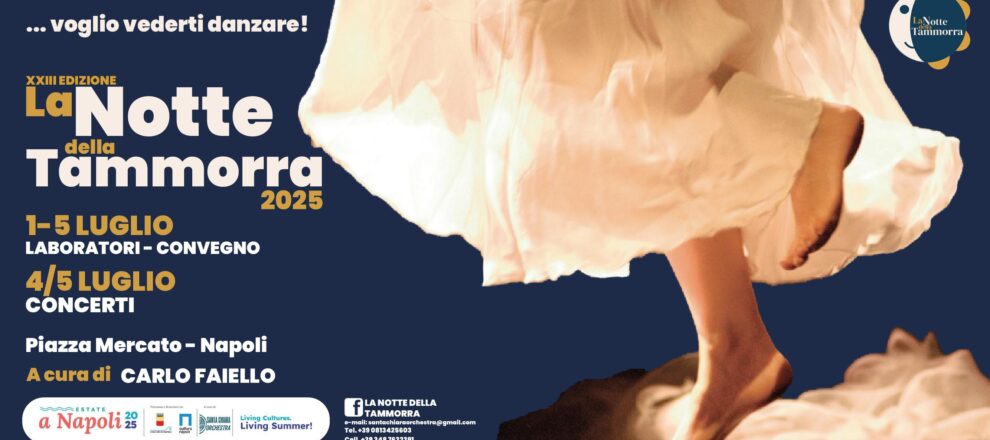Venerdì 4 e sabato 5 luglio 2025, a partire dalle ore 21, torna a piazza Mercato a Napoli la grande festa de La Notte della Tammorra per la sua XXIII edizione. Promosso e finanziato dal Comune di Napoli nell’ambito di Estate a Napoli 2025 e curato da Carlo Faiello, il festival – che negli anni si è affermato fino a diventare uno dei più grandi eventi di musica popolare d’Italia – vedrà la partecipazione di una “colorata carovana” di musicisti e interpreti di altissimo livello alternarsi sul palco a formazioni di musicisti autentici di musica popolare in un itinerario culturale in cui, per la prima volta, saranno messi in connessione il fascino e l’autenticità della musica e della danza popolare antica – alta, profonda, potente – ai linguaggi musicali e visivi più innovativi.