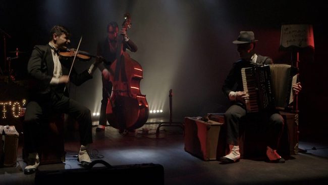 Cinque musicisti italiani di straordinaria sensibilità compositiva ed esecutiva, dotati di un irresistibile e stralunato carisma “Made in Italy” tra ironia ed intensità espressiva. Un violino, una fisarmonica, una chitarra, un contrabbasso e una batteria. I Guappecartò nascono a Perugia come musicisti di strada nel 2004. Durante una loro performance la celebre attrice Madeleine Fischer – collaboratrice, tra i molti, di Antonioni, Sordi, Anna Magnani, Bergman – se ne innamora artisticamente e chiede loro di comporre una colonna sonora per un suo film di imminente realizzazione. Proprio la creazione di quei brani porta i giovani artisti a decidere di credere totalmente nelle proprie capacità. Partono per Parigi, con l’intento di raggiungere più facilmente le strade e le piazze di tutta Europa, spinti dall’unico desiderio di suonare i propri strumenti e condividere la propria musica con più persone possibile.