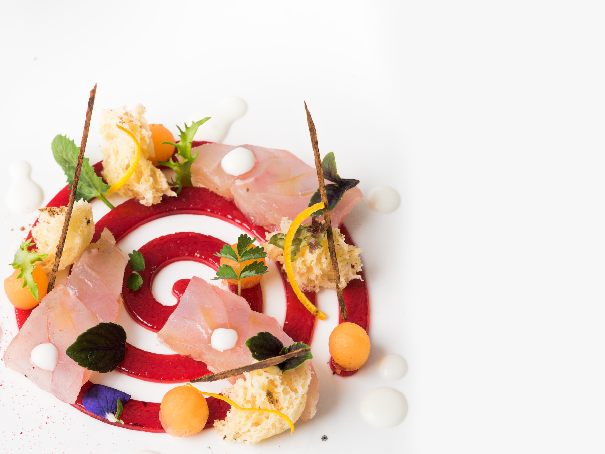– Ricciola affumicata con spugna di pan brioche salato al profumo di cannella, salsa di yogurt e aneto
